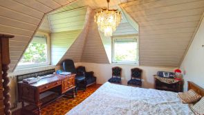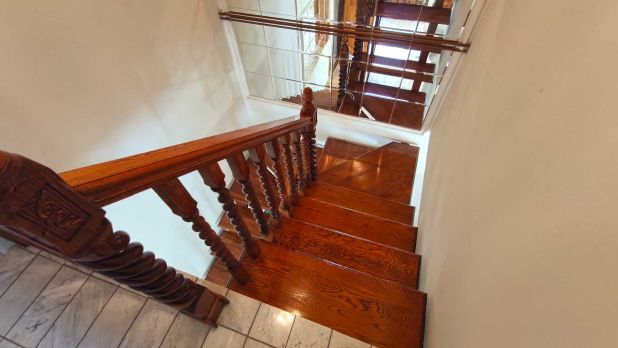 A tetőtérbe felvezető kényelmes lépcső, tölgyfából készült. A közlekedőben van egy klíma.