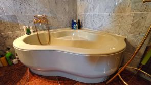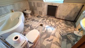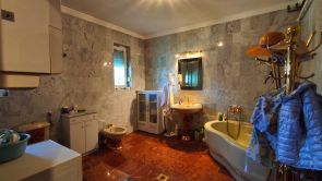 A földszinti fürdőszoba berendezési tárgyai: sarokkád, mosdó, Bidé, WC. Ebben a helyiségben van elhelyezve a gázkazán és az automata mosógép.