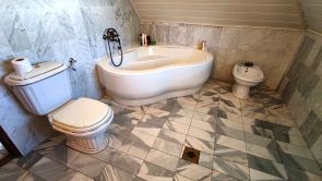 A tetőtéri fürdőszoba berendezési tárgyai: sarokkád, mosdó, Bidé, WC.