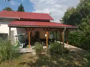A nyaraló külső befoglaló mérete 6,97 m x 5,76 m. A felújítás során fel lett újítva a tető, az esőcsatorna, a terasz, a vízvezeték,- villanyvezetékek és szerelvényeik, illetve a berendezési tárgyaik, burkolatok, nyílászárók, belső ajtók. A tető felújításánál lettek kialakítva a fedett teraszok is. A képeken a délnyugati terasz látszik, a kert felől nézve.