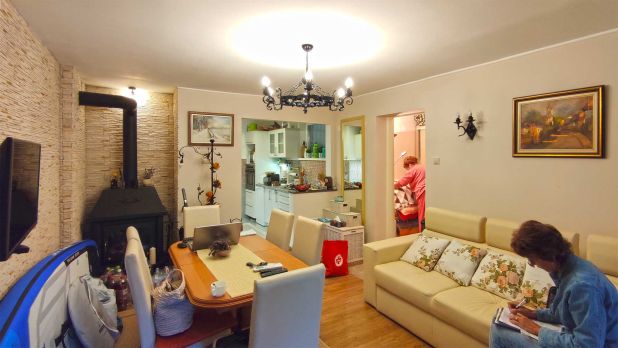 A fedett teraszon át belépve az apartmanba a lakószoba fogadja az érkezőt. A lakószoba ékessége, az öntvény kandalló, mely a hűvös időben kellemes meleget ad, de a klímával is lehet fűteni. Ezen kívül a szobákban NOBO elektromos fűtőpanelekkel lehet fűteni.