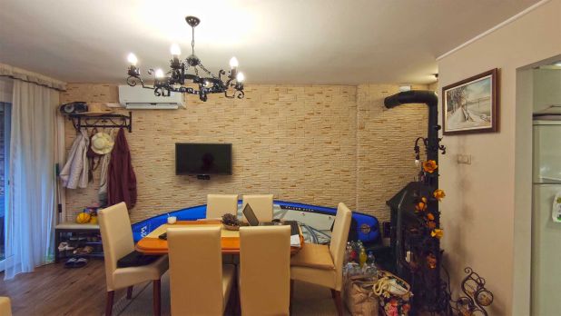 A kép az étkezőt ábrázolja. A bútorok megkímélt állapotúak, újszerűek. A hálószobákba helytakarékos tolóajtókat építtetett be a tulajdonos. A lakószoba,- padlózata vízálló vinyl padló, a szobák parkettásak, a többi helyiség kerámia járólappal burkolt.