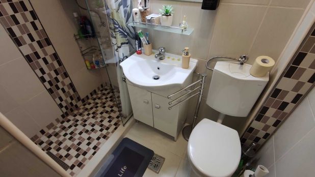 A melegvizet a fürdőszobában felszerelt Ariston típusú vízmelegítő biztosítja.